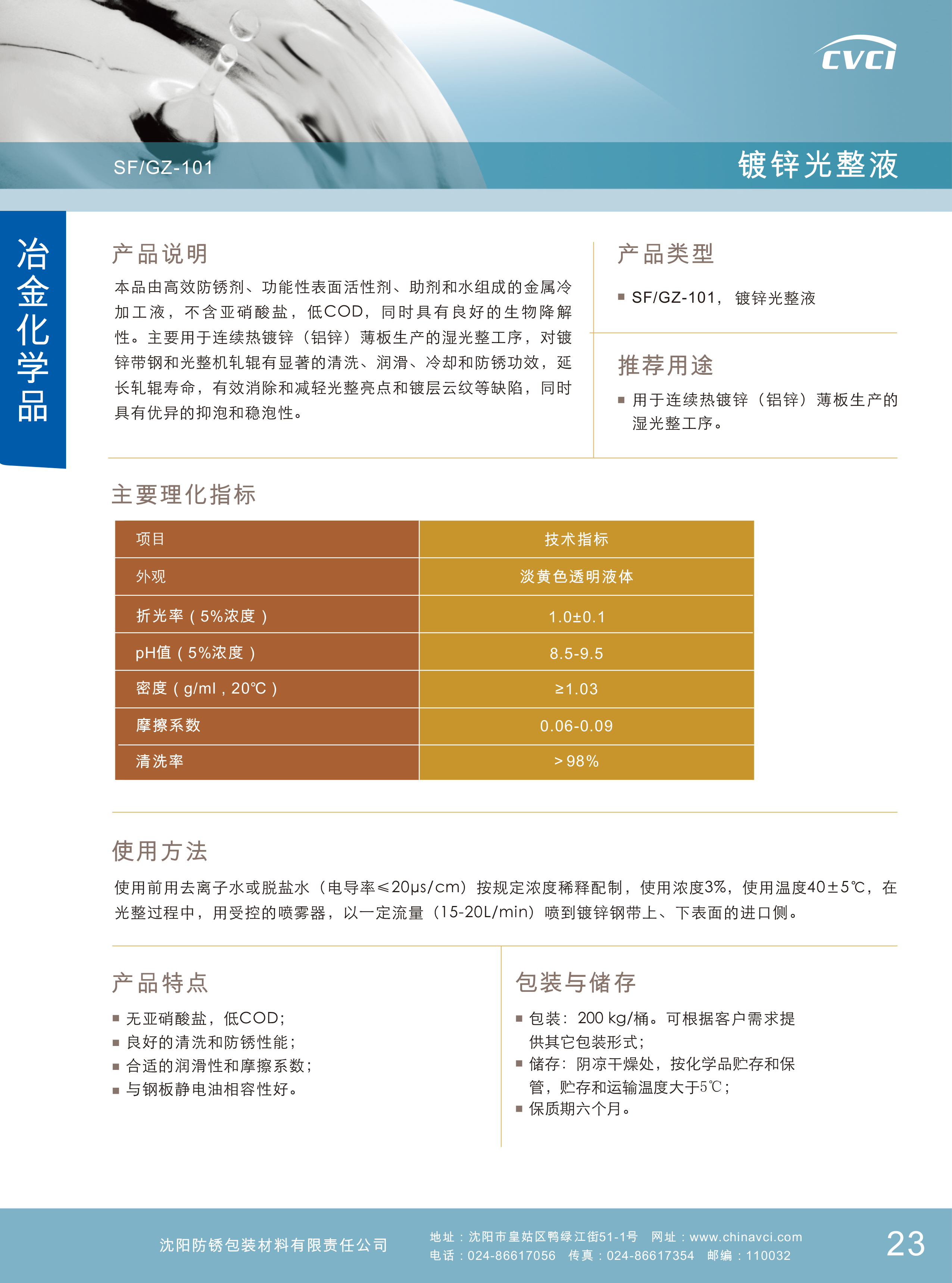 由高效防銹劑、功能性表面活性劑、助劑和水組成的金屬冷加工液,不含亞硝酸鹽,低COD,同時(shí)具有良好的生物降解性。主要用于連續(xù)熱鍍鋅(鋁鋅)薄板生產(chǎn)的濕光整工序,對(duì)鍍鋅帶鋼和光整機(jī)軋輥有顯著的清洗、潤滑、冷卻和防銹功效,延長軋輥壽命,有效消除和減輕光整亮點(diǎn)和鍍層云紋等缺陷,同時(shí)具有優(yōu)異的抑泡和穩(wěn)泡性。