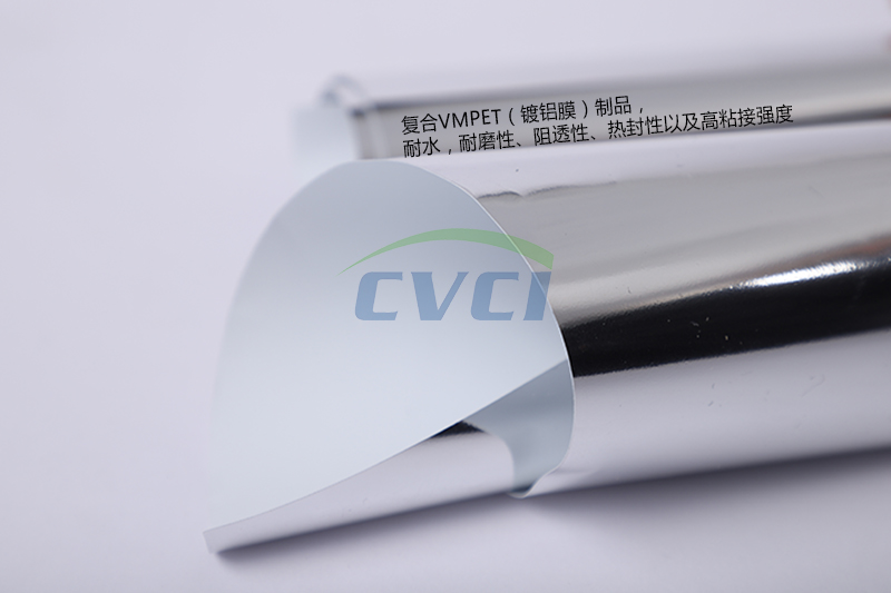 復(fù)合VMPET(鍍鋁膜)制品,具有耐水,耐磨性、阻透性、熱封性以及高粘接強度,對紫外和紅外光具有良好反射性等產(chǎn)品特性。阻隔性性能指標(biāo)為:氧氣透過量cm3/(m2? 24h? 0.1Mpa)≤1.5,水蒸氣透過量(g/m2?24h)≤1.5。